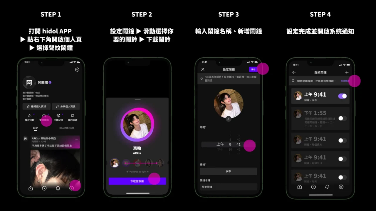 A: 聲紋鬧鐘是 hidol 推出的全新功能,用戶可以選擇特定偶像 / 創作者的聲音,設定為自己手機的早安鬧鐘。讓你每天早晨,都能聽見熟悉又專屬的叫醒語音。